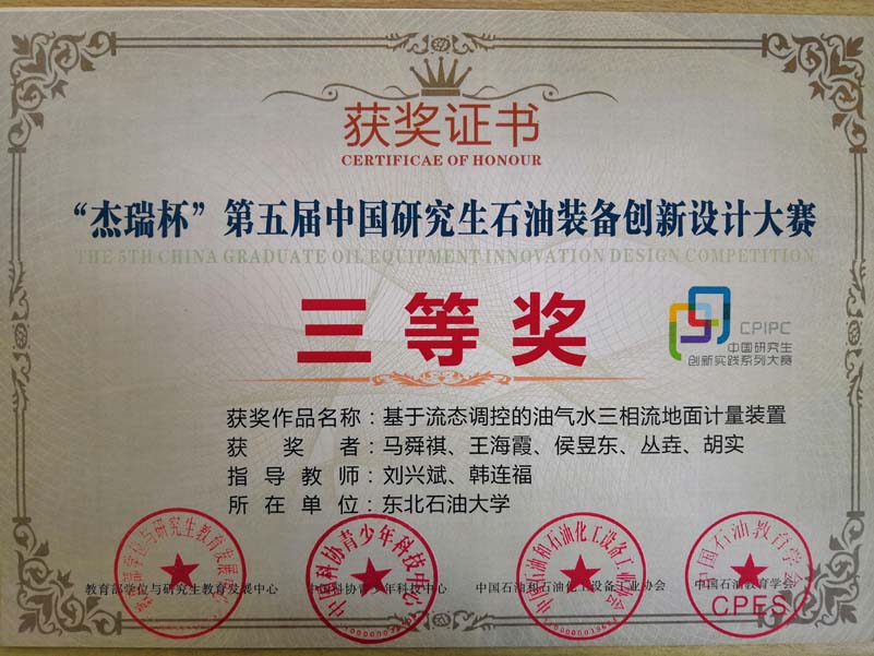 8月27日上午,由教育部学位与研究生教育发展中心、中国科协青少年科技中心、中国石油和石油化工设备工业协会、中国石油教育学会联合举办的“杰瑞杯”第五届中国研究生石油装备创新设计大赛决赛在西南石油大学隆重开幕。据了解,本次决赛共有来自全国54所高校的245件作品参与角逐,其中石油装备类作品162件,通用机械类作品83件。我院由刘兴斌、韩连福老师指导的研究生马舜祺、王海霞、侯昱东、丛垚、胡实组成的代表队,其参赛作品“基于流态调控的油气水三相流地面计量装置”经过层层选拔,成功进入决赛,并荣获全国三等奖的优异成绩。