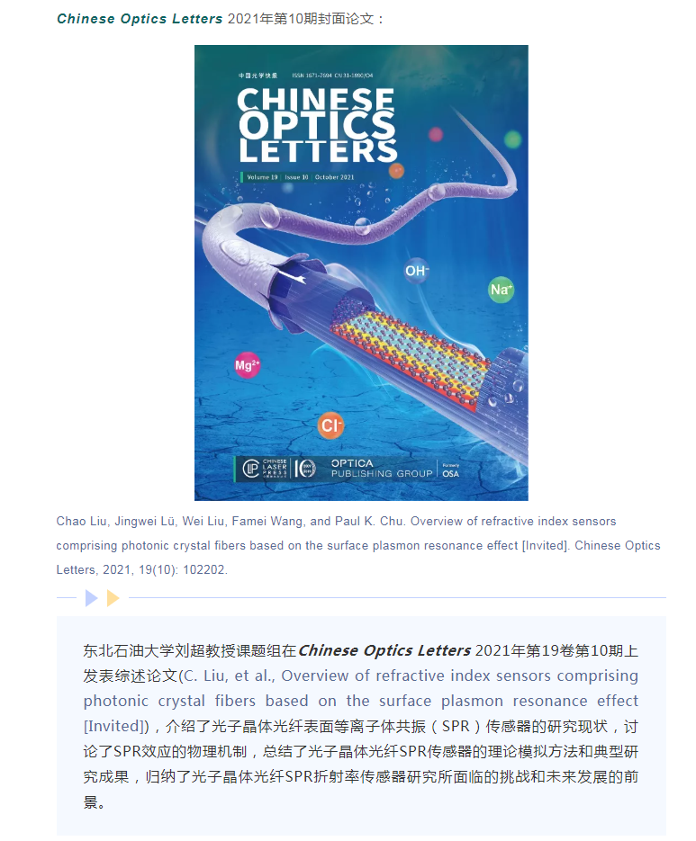 近期,太阳成集团tyc41183刘超教授团队在《Chinese Optics Letters》上发表了一篇题为“Overview of refractive index sensors comprising photonic crystal fibers based on the surface plasmon resonance effect [Invited]”的特邀综述文章,并入选2021年第10期封面文章。这是我校首次在国内光学领域著名学术期刊上发表的特邀封面文章,中国激光杂志社公众号对其进行了宣传和报道。《Chinese Optics Letters》是美国光学学会全球发行的国际性英文版学术期刊,由中国光学学会和中国科学院上海光学精密机械研究所主办,在亚洲入选SCI的光学类期刊中名列前茅,其涉及光纤光学、激光光学和量子光学等诸多领域,2021年影响因子为2.448。