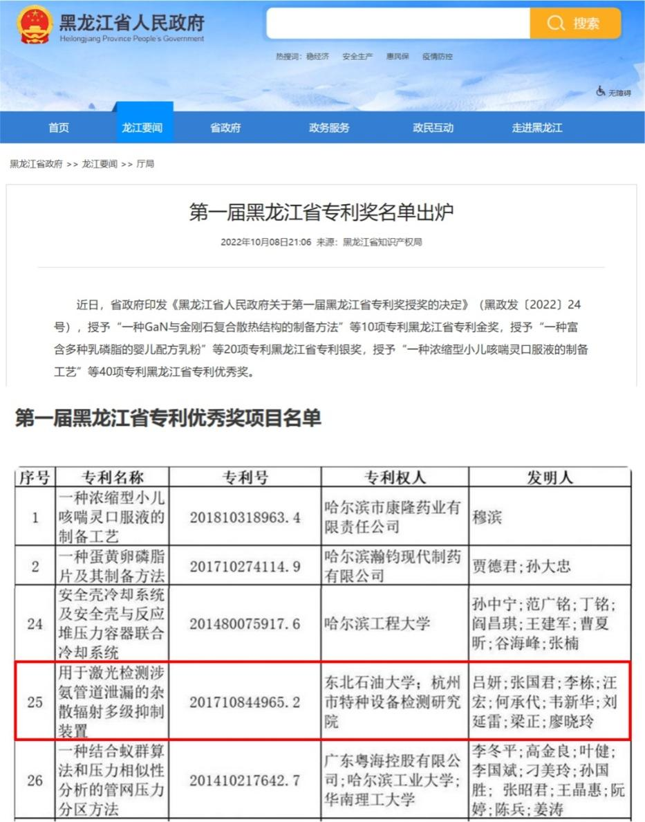 黑龙江省知识产权局于2022年10月8日正式公布了《黑龙江省人民政府关于第一届黑龙江省专利奖授奖的决定》,我院吕妍副教授作为第一发明人取得的国家发明专利“用于激光检测涉氨管道泄漏的杂散辐射多级抑制装置”(专利号:ZL 201710844965.2)荣获黑龙江省专利奖优秀奖。