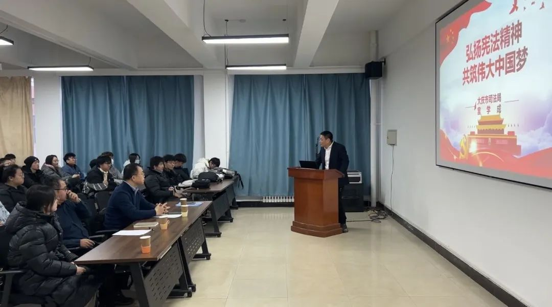在第十个国家宪法日来临之际,为弘扬宪法精神,推动宪法教育走进校园、走入课堂,在大学生群体中营造尊崇宪法、学习宪法、遵守宪法、维护宪法权威的良好氛围,大庆市司法局宫学成、宋雪峰、赵旭忠三名同志,于2023年11月29日到我院,与师生共同学习宪法知识、打卡国家宪法日。