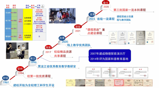 《大学物理》课程自1961年开设以来,持续建设发展,1994年成校首批优质课程,1996年教研室获“黑龙江省优秀教研室”,2007年建设物理探索演示厅,2014 年获评 “国家科普教育基地”,近 5 年获校精品资源共享课程等多项荣誉,2023年被评为省级线下一流课程。课程聚焦专业需求,构建四层次双模块教学体系,依托“教为引导、学为主导”的教学模式,以问题为导向,融入演示实验、动画视频等资源;打造智能示踪式考核机制,有效提升课堂参与度和学习实效;实现从理论、应用至综合素质的多维科学评价。近年来,课程团队屡获省级教学成果奖,学生成绩与竞赛表现显著提升,在全国物理基础教育领域具广泛影响与示范价值。