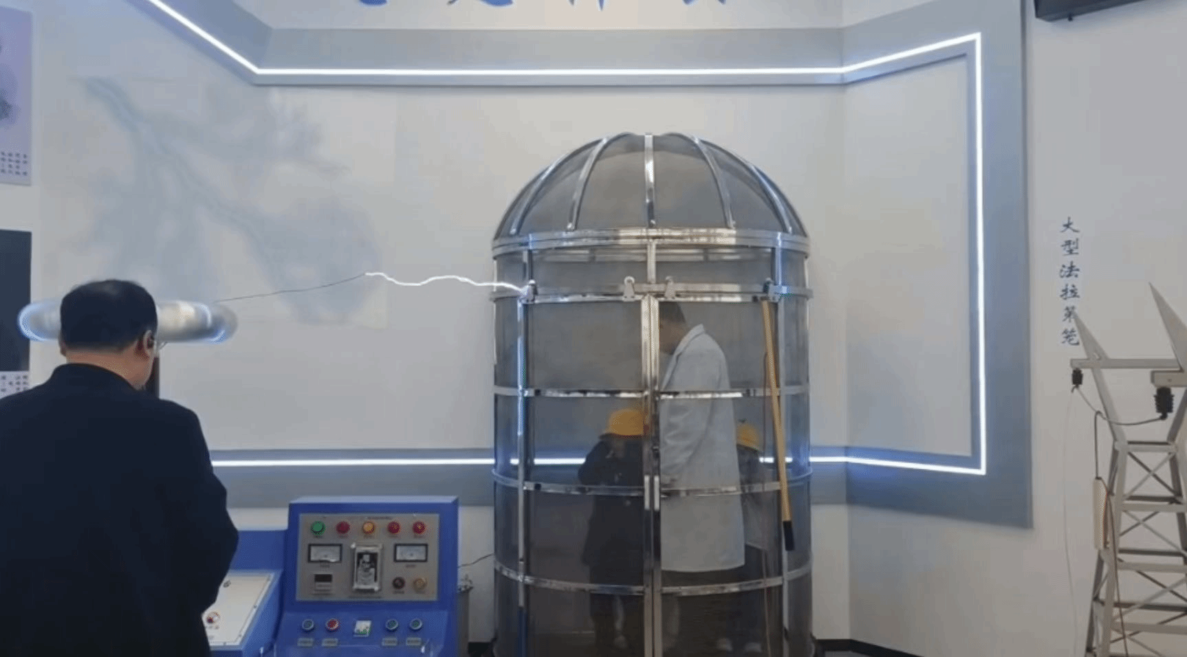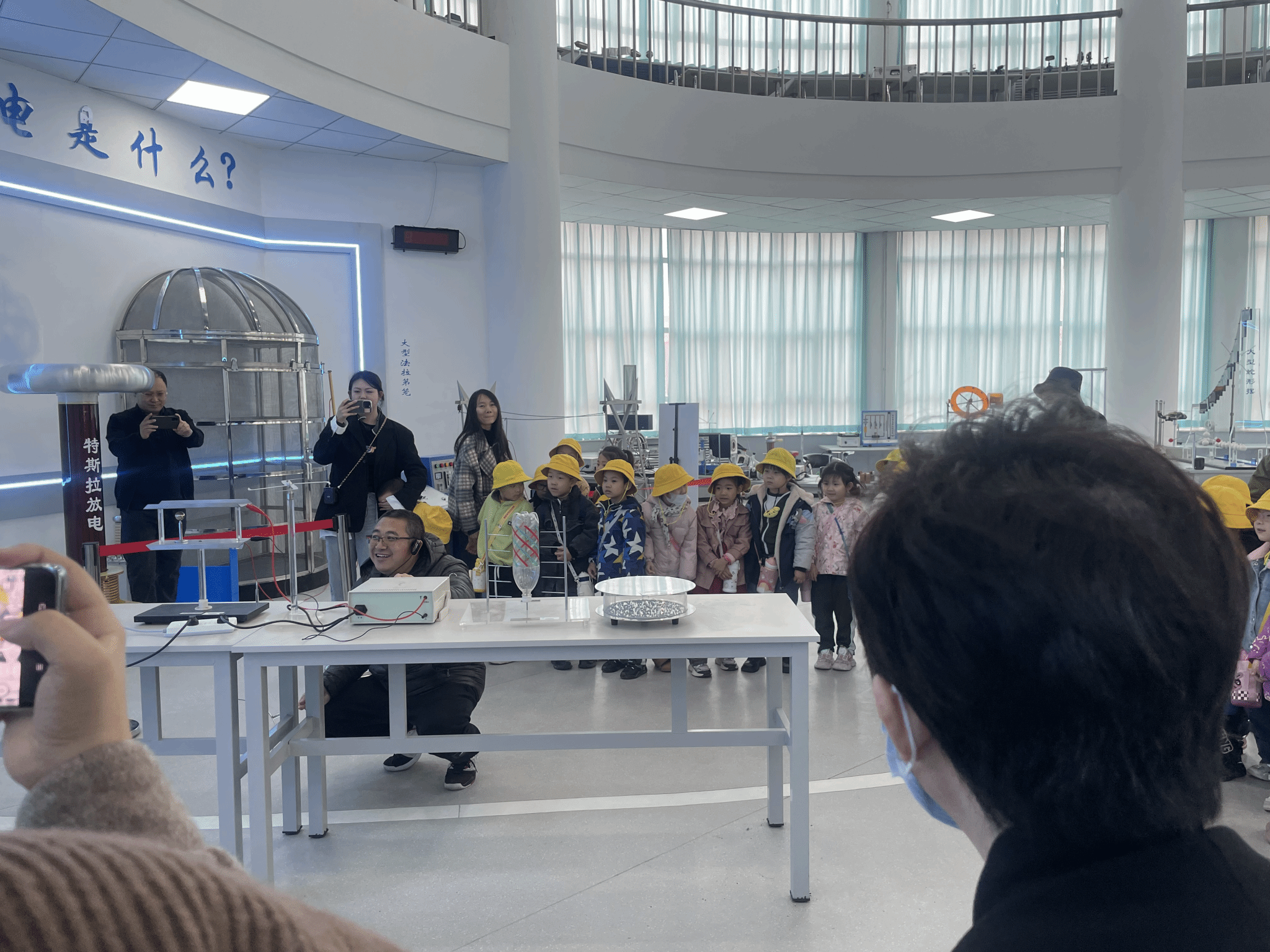 超导磁悬浮实验展示了低温下小球悬浮的“魔法”,记忆合金受热复原的神奇特性更让孩子们直呼“像会变形的玩具”。在法拉第笼体验环节,小朋友触摸带电笼体却安然无恙,现场欢呼不断。