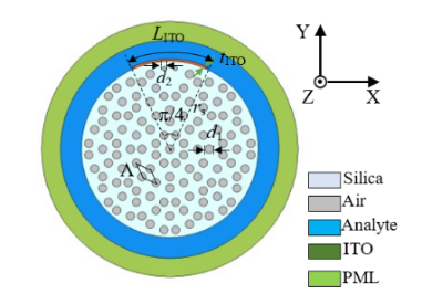 近日,我院2018级硕士生孙久帝又在《Applied Optics》(中科院JCR三区,IF=1.961)发表了一篇关于光子准晶光纤表面等离子体共振折射率传感器的科研成果(题为High-sensitivity SPR sensor based on eight-fold eccentric core PQF with locally coated indium tin oxide)。该成果设计了一种基于八重偏芯结构的光子准晶体光纤,并采用光纤表面局部涂覆等离子体材料的方法避免传感器产生高阶损耗,有效提高了折射率测量灵敏度。在折射率为1.380-1.413的检测范围内,波长灵敏度高达96667nm/RIU,折射率分辨率为1.034×10-6RIU。相关研究工作已申报发明专利。