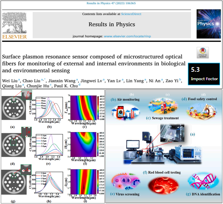近日,我院20级博士研究生刘伟在导师刘超教授的指导下,以微结构光纤为传感基底,结合SPR前沿技术,研究了一种可同时检测生物体内外环境的传感器,可实现宽折射率检测范围(1.00-1.38)、高灵敏度(20000nm/RIU)以及普适的工作波段(900-2750nm),进一步推动该类传感器的应用和发展。该成果被国际知名SCI期刊《Results in Physics》(中科院2区,IF=5.3)收录。