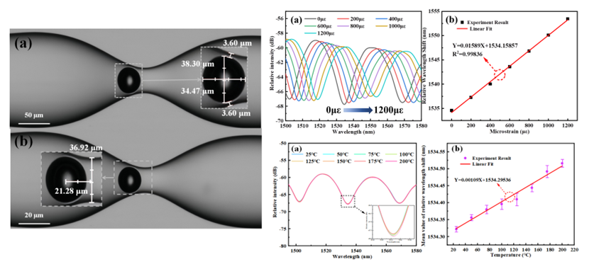 近日,我院2022级硕士研究生李薇在光纤传感团队吕靖薇老师的指导下,在国际权威光学SCI期刊《Optics Express》(中科院2区TOP;IF=3.8)上发表了题为“High-sensitivity strain sensor based on an asymmetric tapered air microbubble Fabry-Pérot interferometer with an ultrathin wall”的研究论文,该研究提出了一种具有非对称锥形结构和超薄壁空气微泡的法布里-珀罗干涉传感器。这种独特的非对称结构使微气泡在应力作用下更容易变形,实验证明,传感器的应变灵敏度高达15.89 pm/με。在25-200 ℃的温度范围内,传感器的温度灵敏度和交叉灵敏度分别为1.09 pm/℃和0.069 με/℃,减少了温度变化引起的测量误差。该成果为复杂环境下的应变测量提供了新的方法,具有很高的商业潜力。