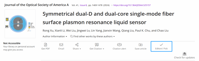 近日,我院光纤传感团队的硕士研究生徐榕发表了题为“Symmetrical dual-D and dual-core single-mode fiber surface plasmon resonance liquid sensor”的研究论文,该成果发表在《Journal of the Optical Society of America A》(中科院三区)上,并被选为“Editors’Pick”(编辑精选)。(注:Editor's Picks serve to highlight articles with excellent scientific quality and are representative of the work taking place in a specific field)意味着该工作在相关领域极具代表性。
