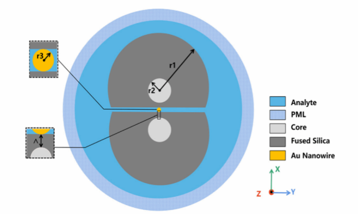 该成果在两个D型单模光纤中间放置金线构建了一种对称的表面等离子体共振(SPR)传感器,该结构能有效提高光子和自由电子之间的动量匹配,通过双向耦合增强表面等离子体共振效应,实现对生物溶液折射率变化的高灵敏监测。在近红外区域表现出优异的性能,在1.31-1.40折射率范围内,最大波长灵敏度为21000nm/RIU,振幅灵敏度为586.62 RIU-1。该传感器在生物医学、化学分析及其相关领域展现出广泛的应用潜力和前景。