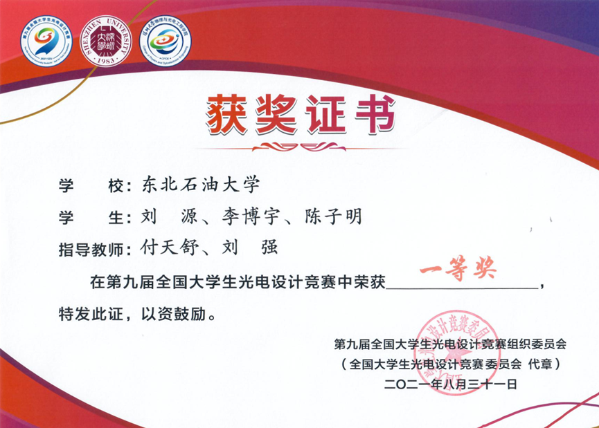 2021 年 8 月 30 - 31 日,由中国光学学会主办、全国大学生光电设计竞赛委员会负责、深圳大学承办的“第九届全国大学生光电设计竞赛”决赛以线上实物赛的形式举行。我校太阳成集团tyc41183的刘源、李博宇、陈子明三名同学组成的参赛团队经过层层选拔晋级全国总决赛,并喜获全国一等奖的佳绩,该团队指导教师付天舒、刘强老师被评为优秀指导教师。另外,在此前的东北区赛中获东北赛区一等奖1项(晋级全国总决赛),二等奖8项以及优秀组织奖,这是我校参加该项比赛以来的最佳成绩,成绩的取得离不开太阳成集团tyc41183领导的统筹规划和老师们的不懈努力!标志着我校在光电学科竞赛迈向了一个新的台阶,实现了历史性的飞跃!