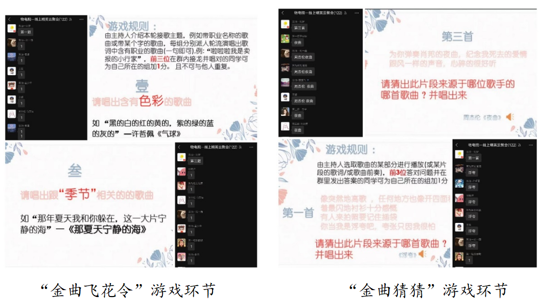 在才艺展示环节后,通过金曲飞花令、金曲猜猜、妙音天成的游戏环节继续带动全体师生积极参与其中,活动气氛一度达到了高潮,真正达到了本次素质拓展活动的目的。