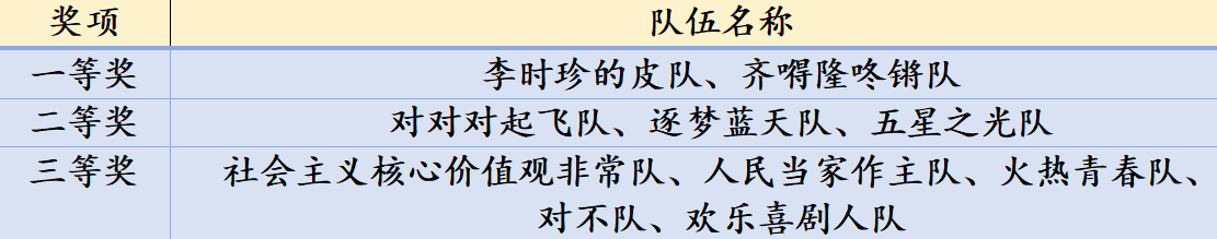 经过丰富有趣的游戏环节后,本次“五四青年”团队线上素质拓展活动也接近尾声了,最后环节的顺利举办也成功为“精英青年云聚会,共抗疫情你我他”系列线上主题教育活动画上了圆满的句号。根据团队累计的积分排序,恭喜以下团队分别获得一、二、三等奖。