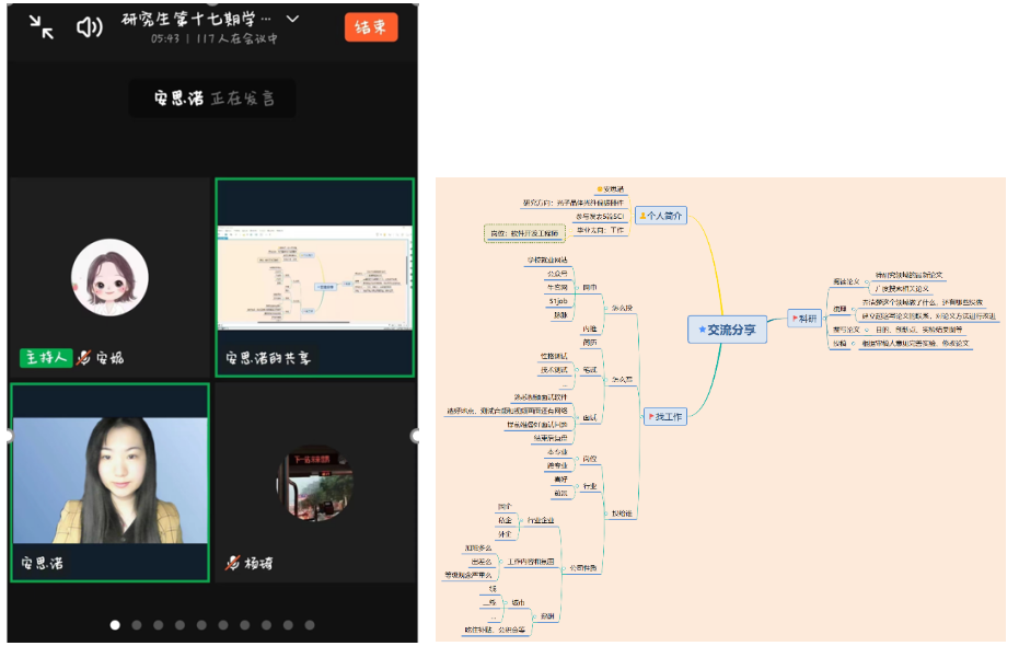此次学术交流活动中,2019级研究生安思诺从科研方向和找工作经验两方面进行分享。科研主要分为阅读论文、梳理、撰写论文和投稿四个方面,明确阅读文献需抓住重点、掌握规律,才能确定研究方向和目标。找工作经验主要是围绕简历投给谁、怎么投和怎么写三大部分,分享了从挑选公司、怎么写简历到面试的整个过程,为即将找工作的师弟师妹们提了实用的建议。