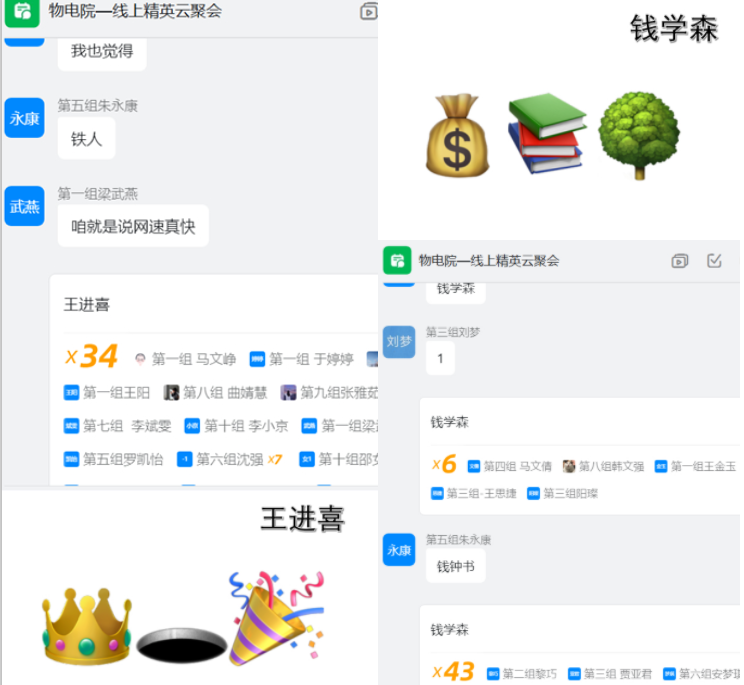 第二个游戏是“emoji表情——科学家猜猜猜”。由主持人随机播放事先准备好的emoji组合,在倒计时结束之后由同学们在群内抢答并发出科学家的名字,该环节极大增加了活动的趣味性,也极大地调动了同学们参与活动的热情。