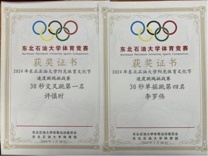 在跳绳比赛中,我院时韬、李罗伟同学分别取得30秒单摇跳第一名和第四名的成绩,许慎时同学取得30秒交叉跳第一名的成绩。在几位同学的共同努力下,我院取得了速度跳绳第一名的好成绩!